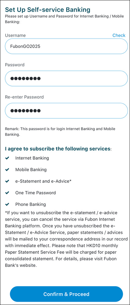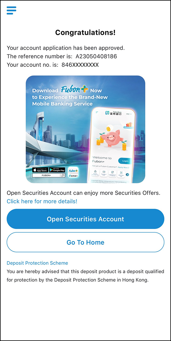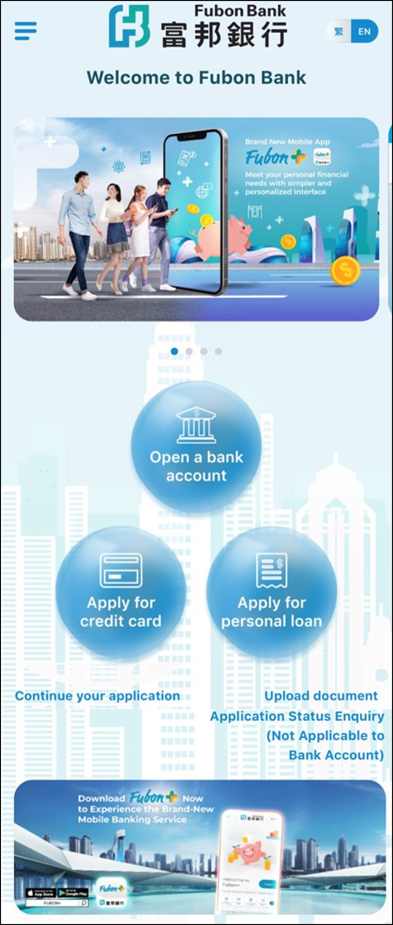 *Actual time for account opening depends on the network environment, any outage or suspension in your internet connection, the processing time of your mobile devices and other factors. The Fubon GO Service is only applicable to customers in Hong Kong Special Administrative Region.
