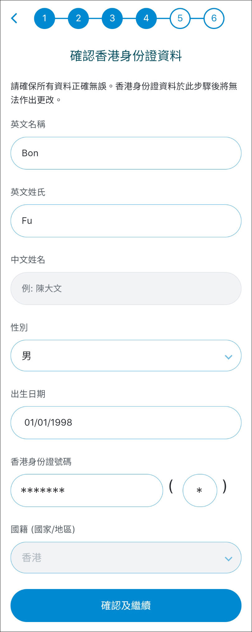 確認您的香港身份證資料。